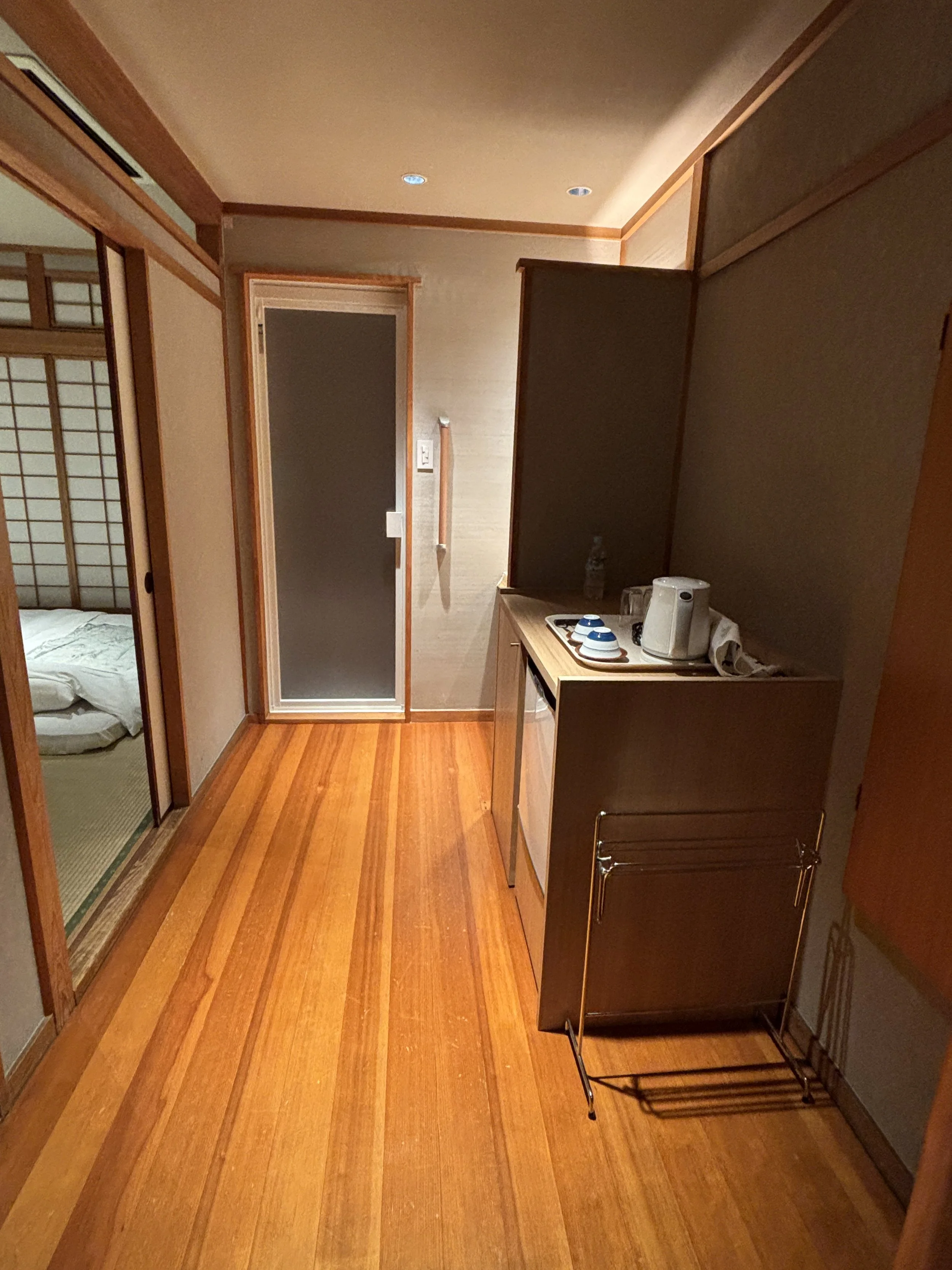 Our room at Ryokan Ryokufuso was quite large and, of course, laid out in traditional style. As you can see in the pictures below, it consisted of a large living room (which doubles as bedroom) and an ante-chamber with a little sink and table to prepare tea, plus the shower room and toilet in two separate pieces.