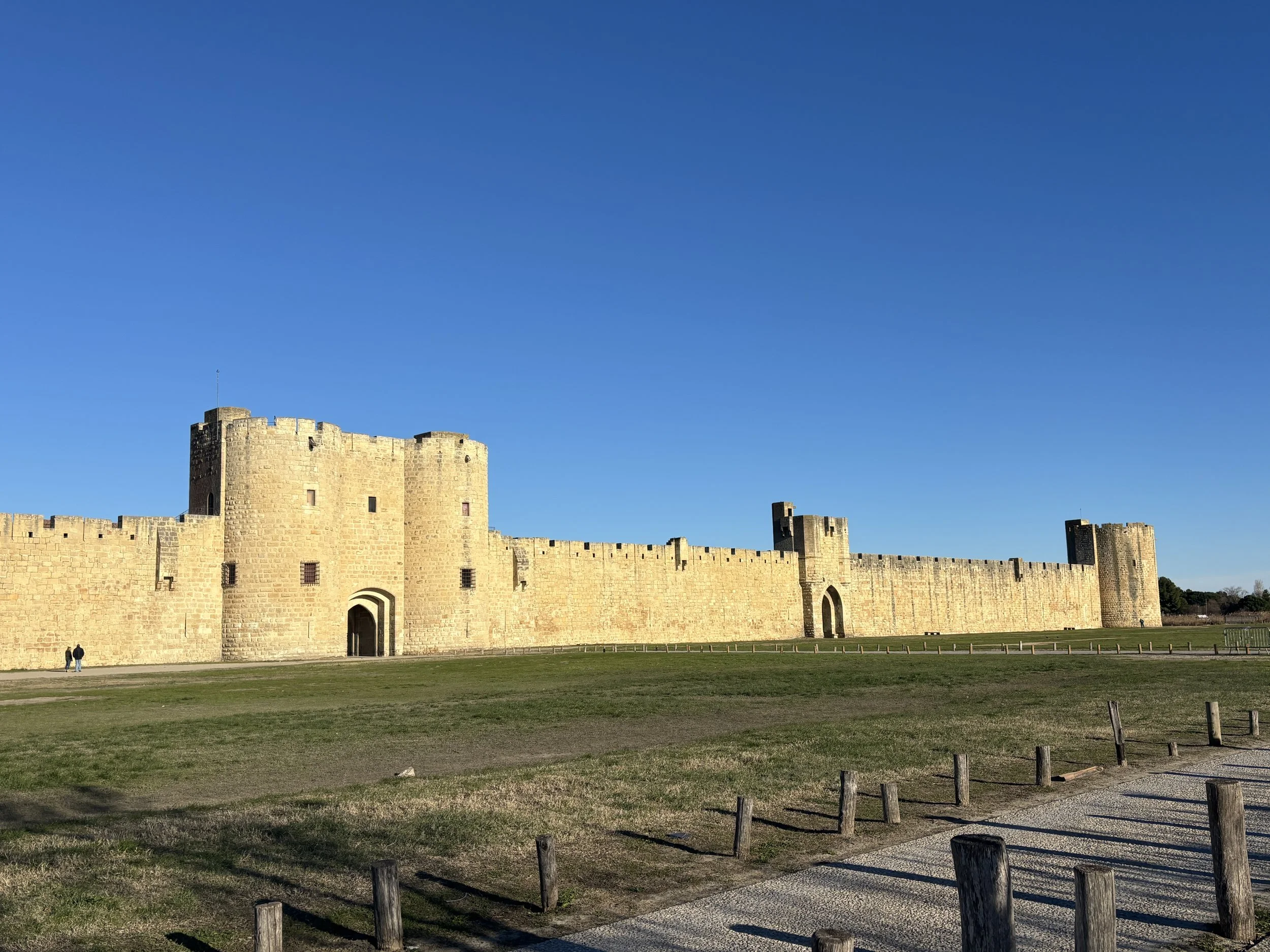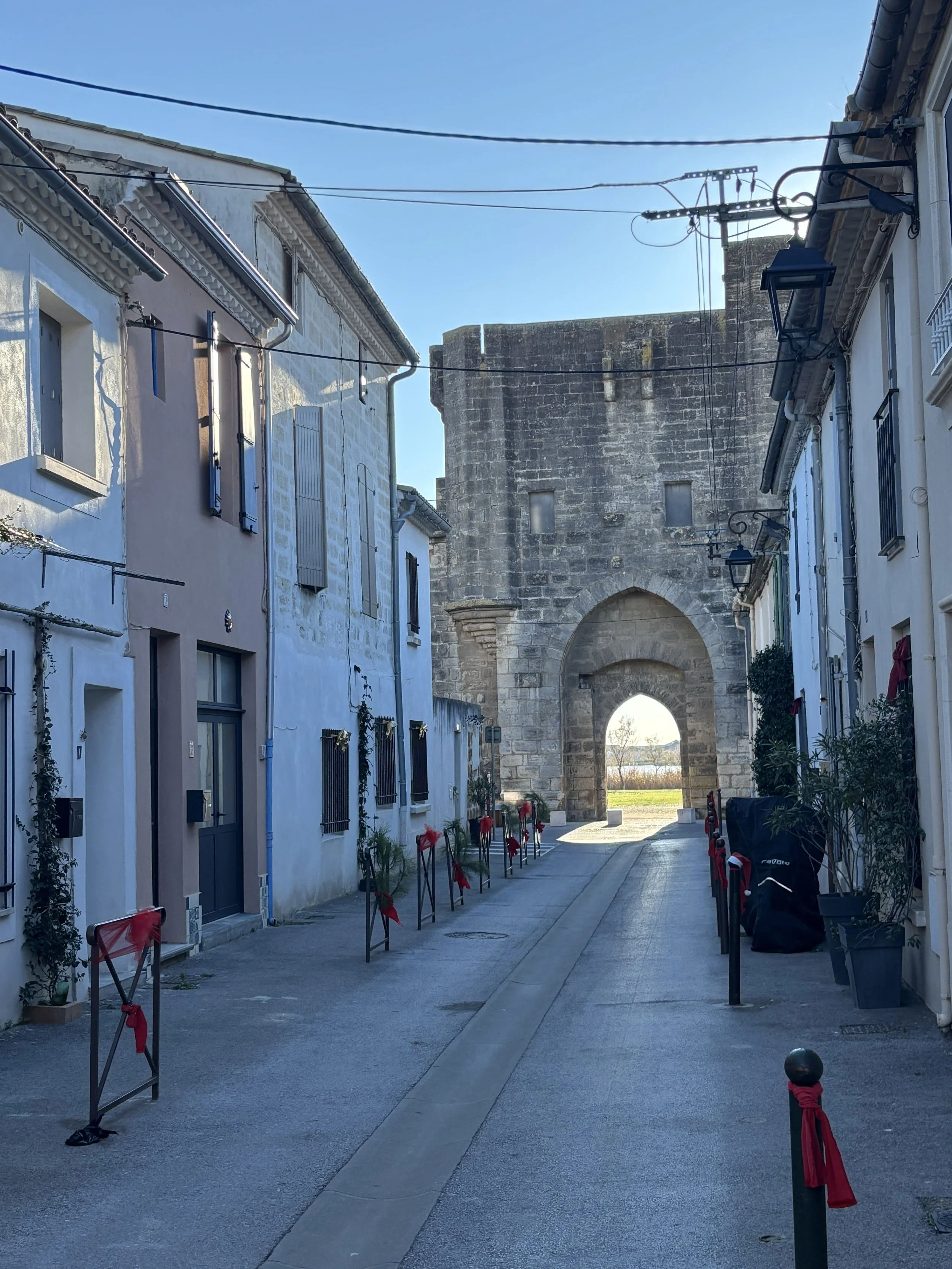 As its name implies (“Dead Waters” in Occitan language), Aigues-Mortes is surrounded by water and swamps pretty much on all sides. It is also pretty close to, but not directly on the sea shore. There is a canal on one side of the old town and a lagoon and salt pans on the other one.