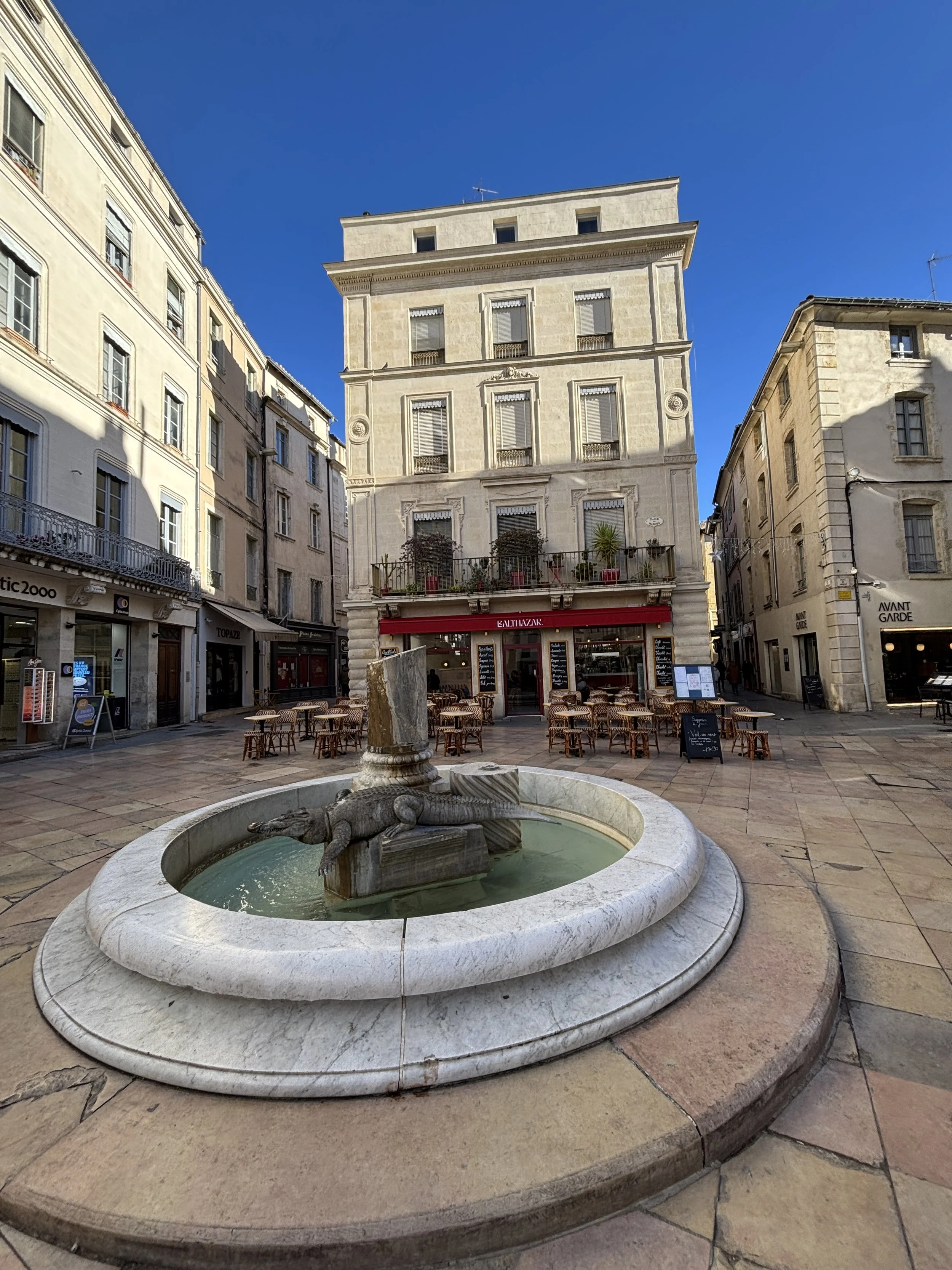 Here are quite a few details from the morning walk through downtown Nîmes, from the crocodile that adorns one of the fountains in the old town, to some touches of contemporary architecture that mix with the more traditional harmony of the old town.