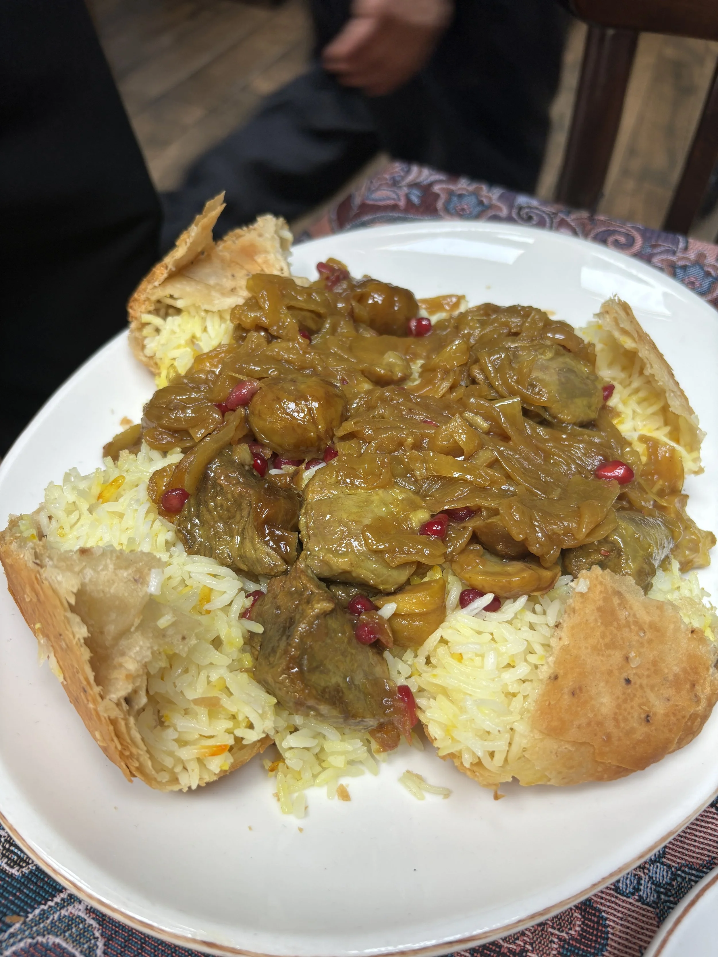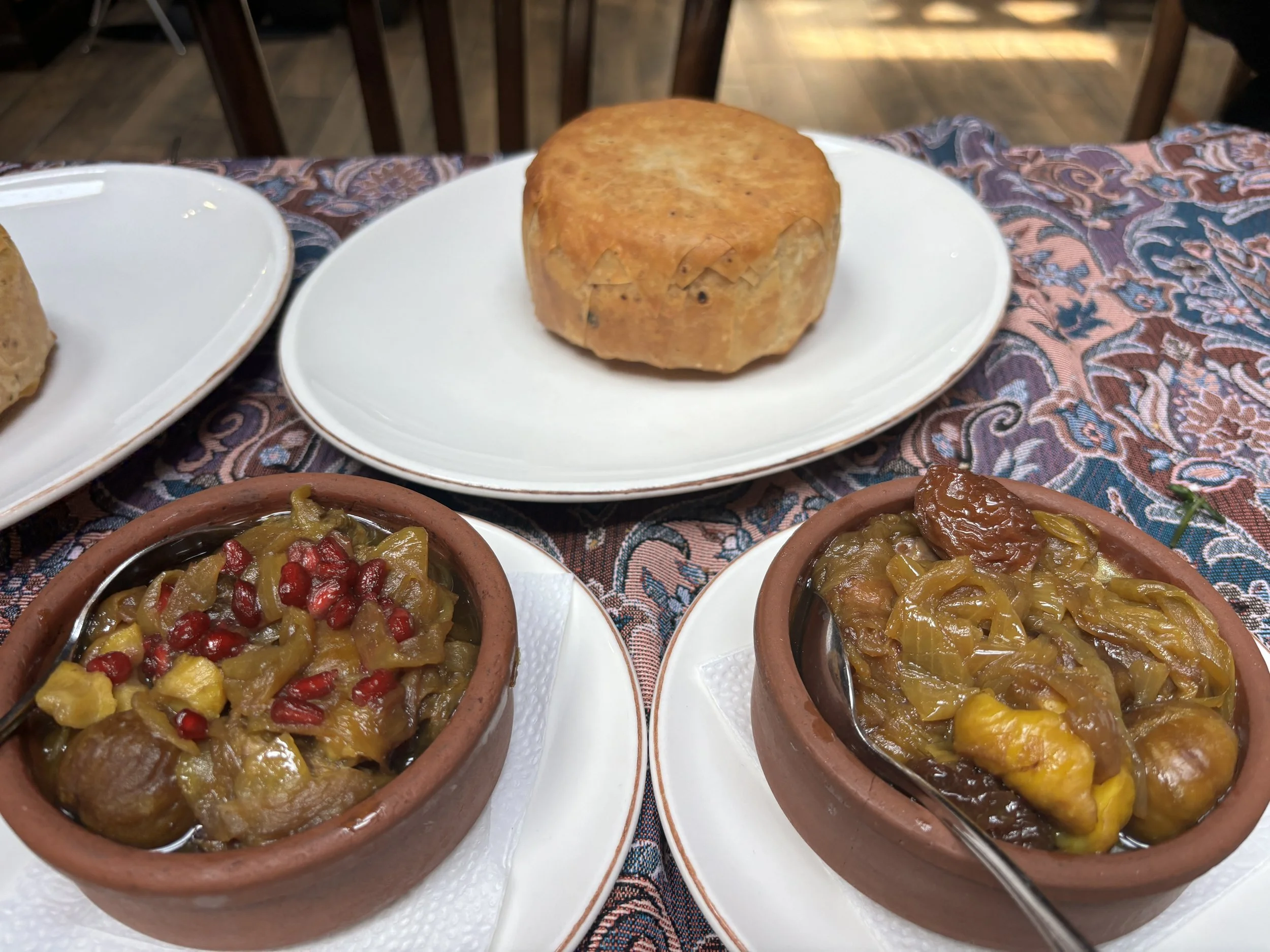 The signature dish I recommend tasting is Shah Plov, which consists of rice cooked inside this type of dough cake you can see depicted below, which is called kazmag, accompanied by lamb and dried fruit stew (chestnuts or plums with pomegranate). But this is not all…